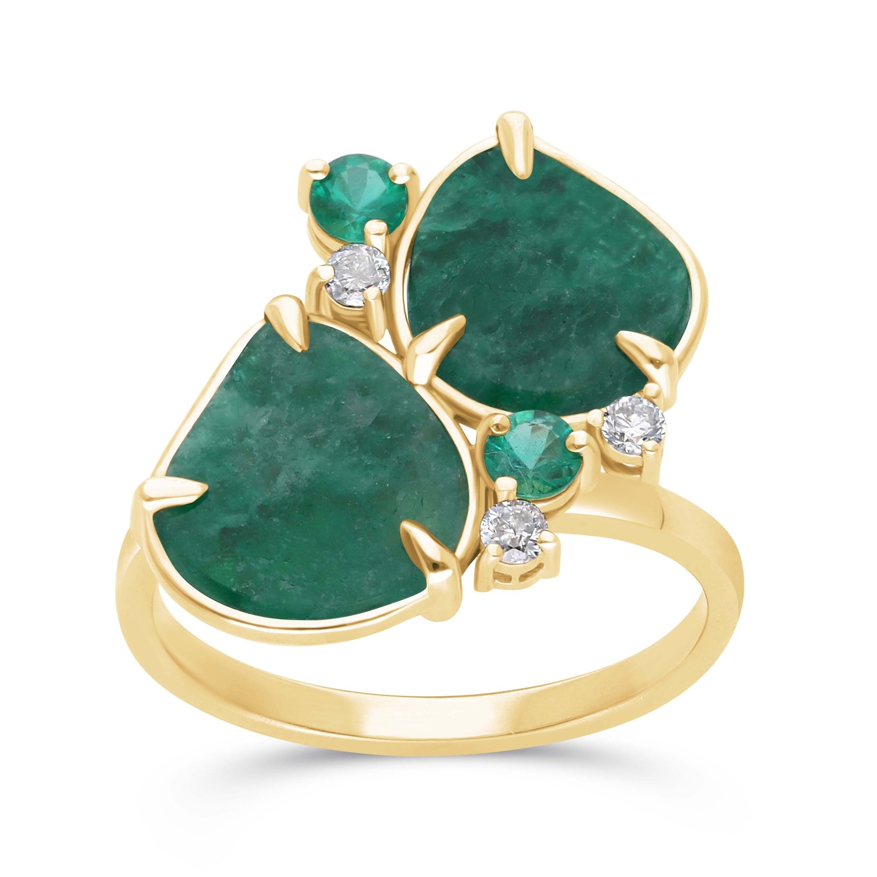 Step into the enchanting world of 'Amazonica,' a captivating jewelry collection that redefines elegance. This collection boldly ventures into the unconventional, embracing a unique approach to emerald craftsmanship. The Amazonica duo ring is a masterpiece that harmoniously blends the exclusive rugged charm of emerald slices with the brilliance of diamonds and precision-cut emeralds, creating an exquisite synergy inspired by the fluid and organic contours of water lilies.